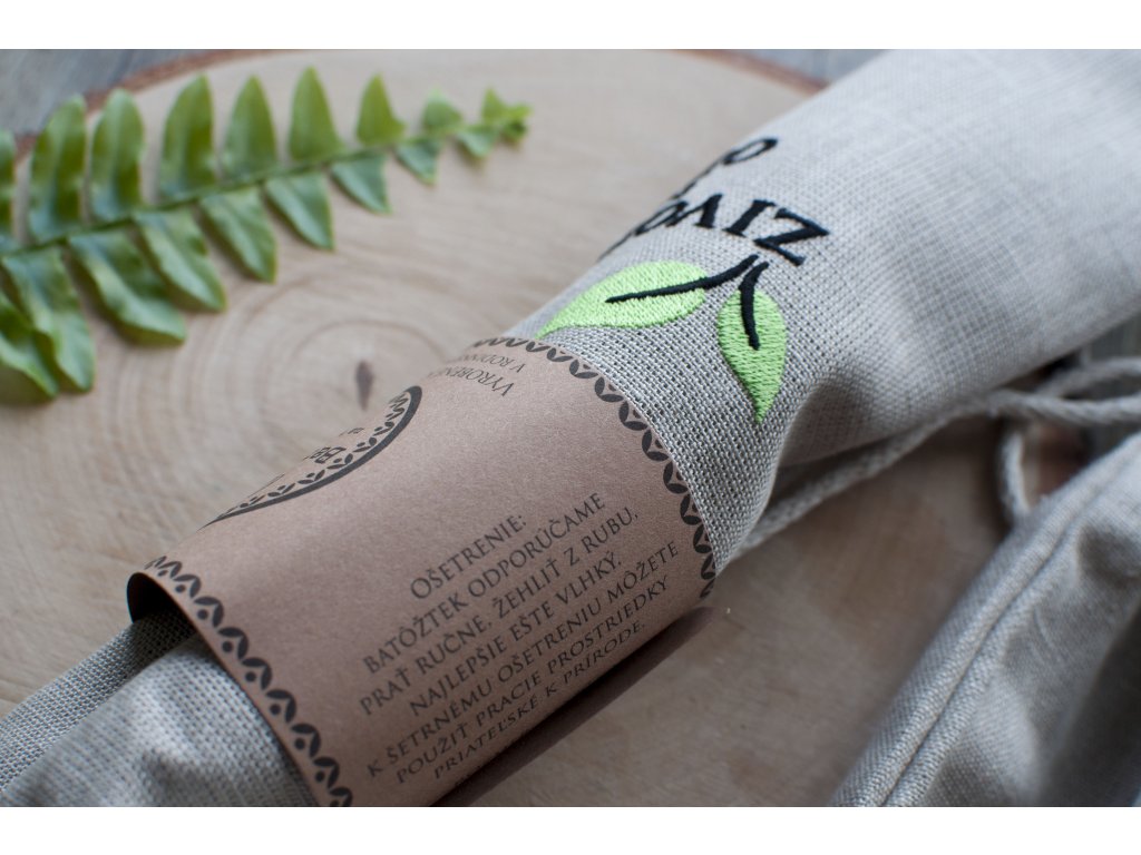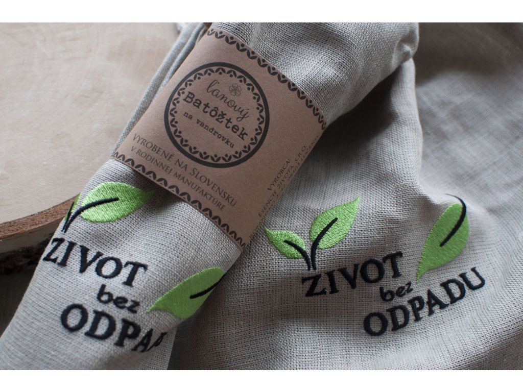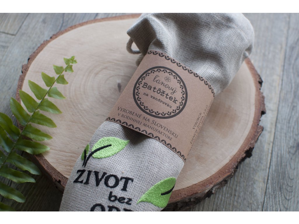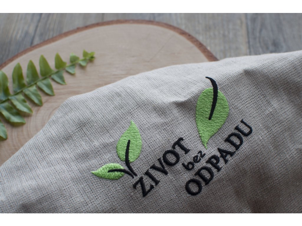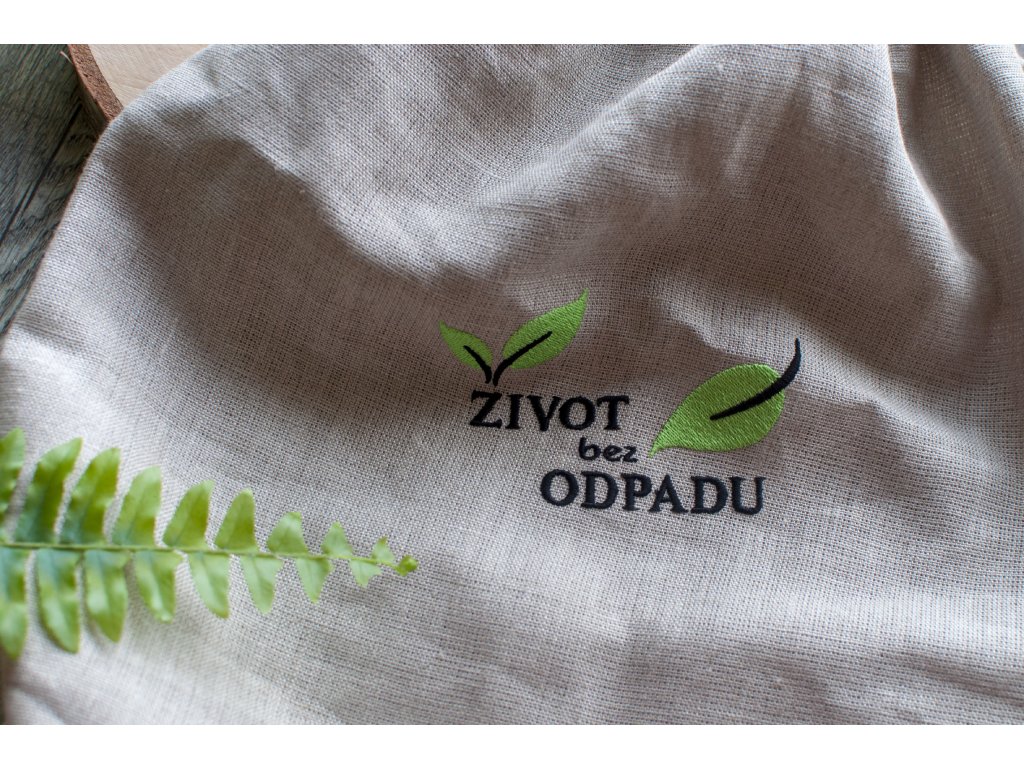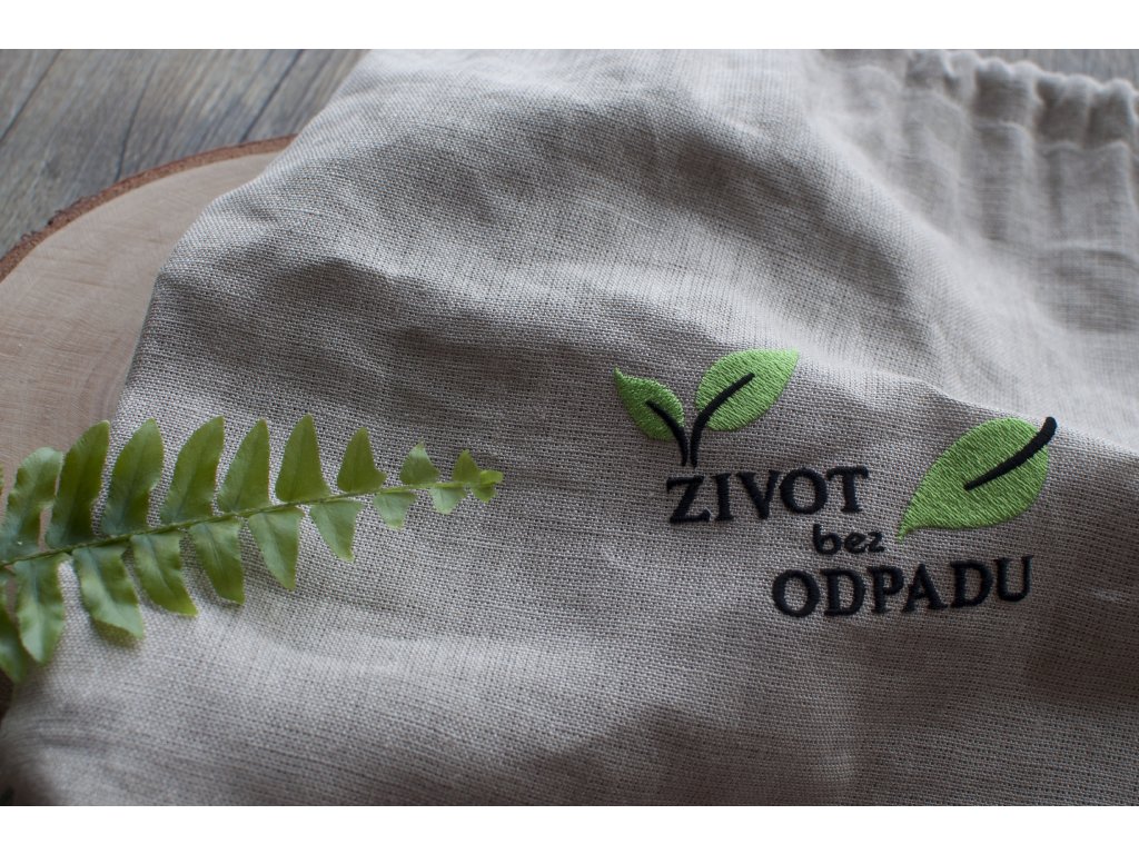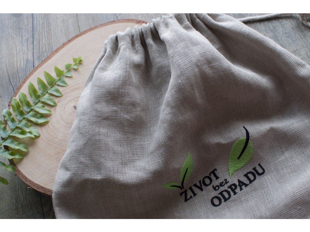 ࿔ tento praktický ľanový batôžtek má na prednej strane vyšívané logo ŽIVOT bez ODPADU