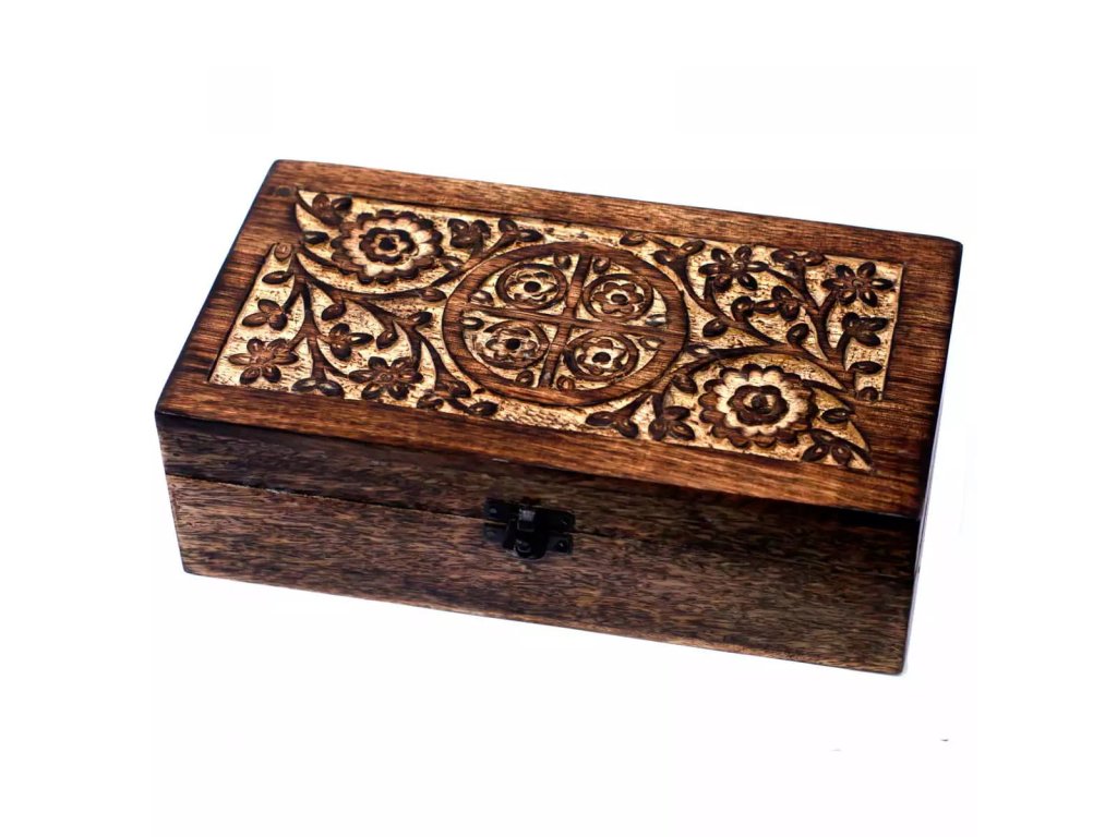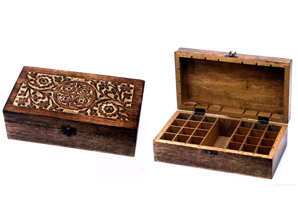 Kvetinová krabička na esenciálne oleje je špeciálne vyrezávaná a zdobená ručne z kvalitného mangového dreva. Túto krásnu drevenú krabičku oceníš hlavne vtedy, ak chceš mať svoje prírodné esenciálne oleje alebo olejové zmesi krásne usporiadané či jednoducho prenosné.