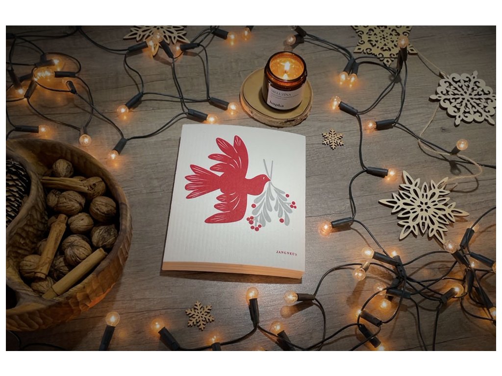 Prateľná hubka z prírodného materiálu v originálnom severskom dizajne s potlačou krásnej holubice s imelom.