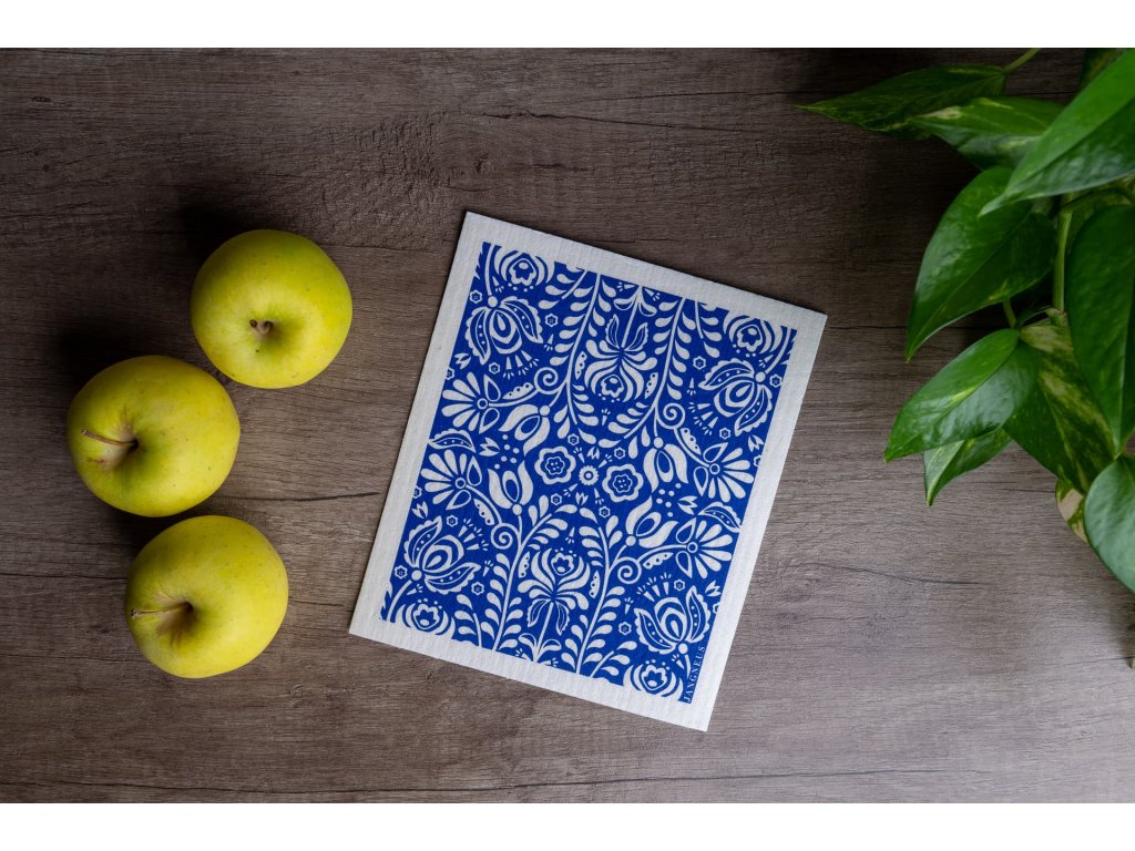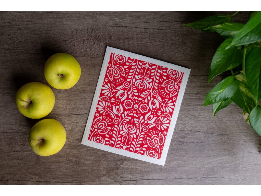 Prateľná hubka z prírodného materiálu v originálnom severskom dizajne s potlačou kvetov v 4 farbách (béžová, červená, modrá a tmavo zelená).