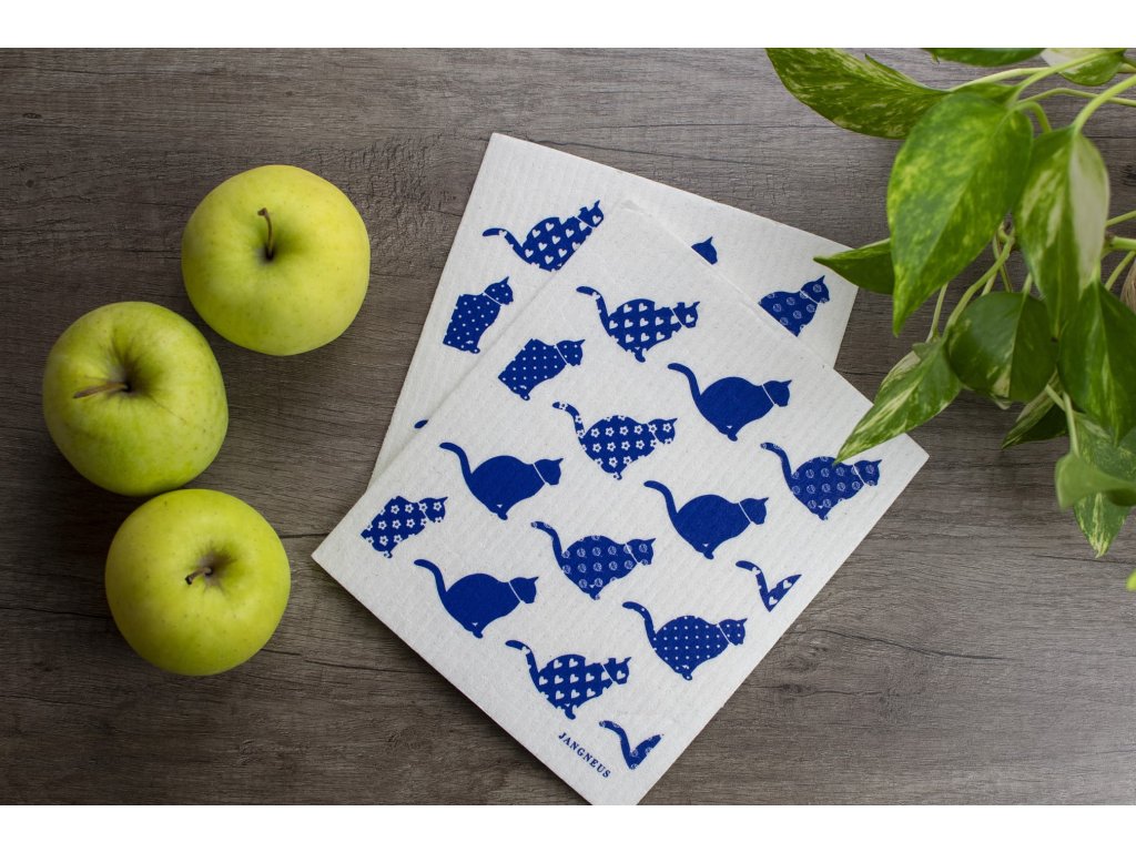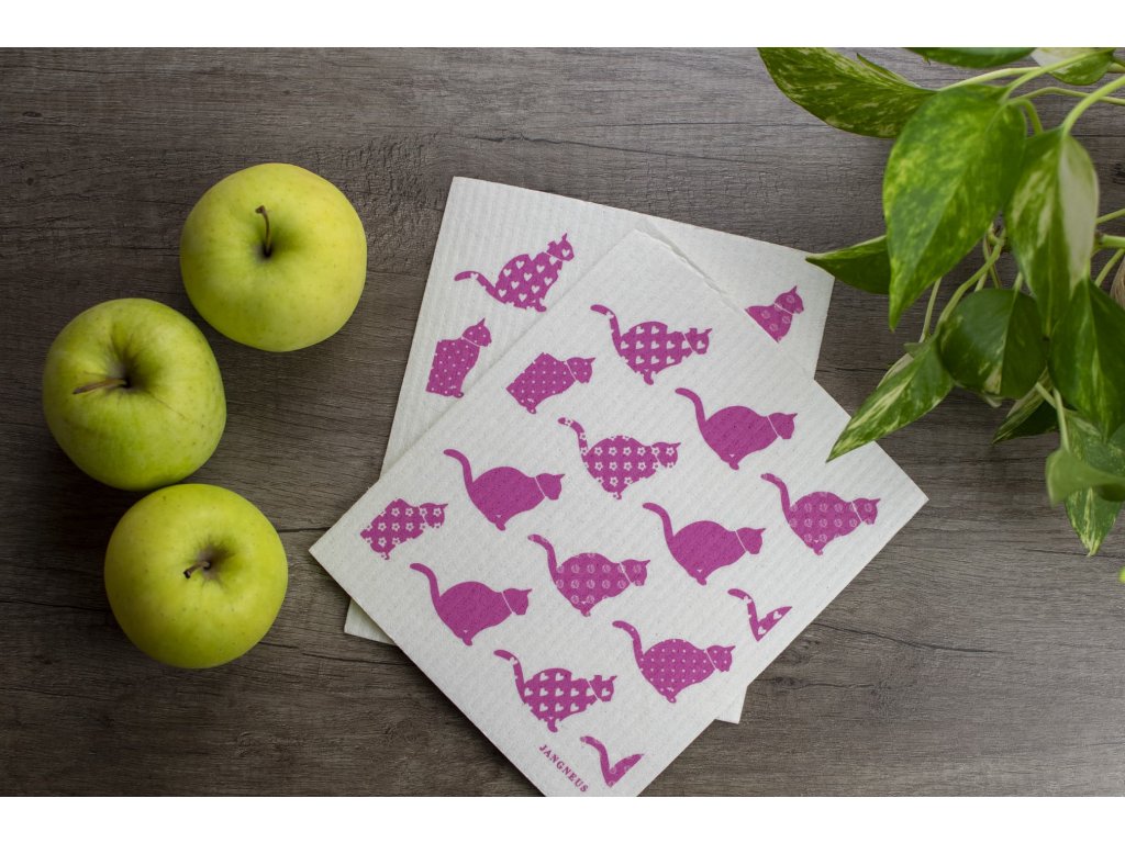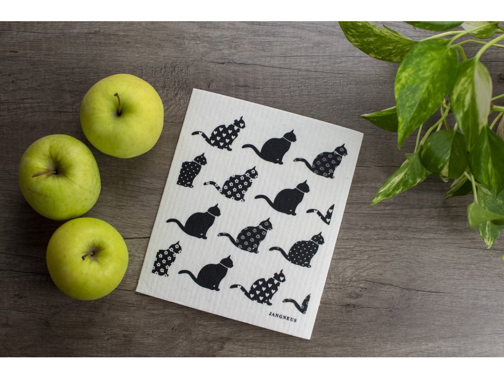Prateľná hubka z prírodného materiálu v originálnom severskom dizajne s potlačou mačiek v 3 farbách (čierna, modrá a ružová).