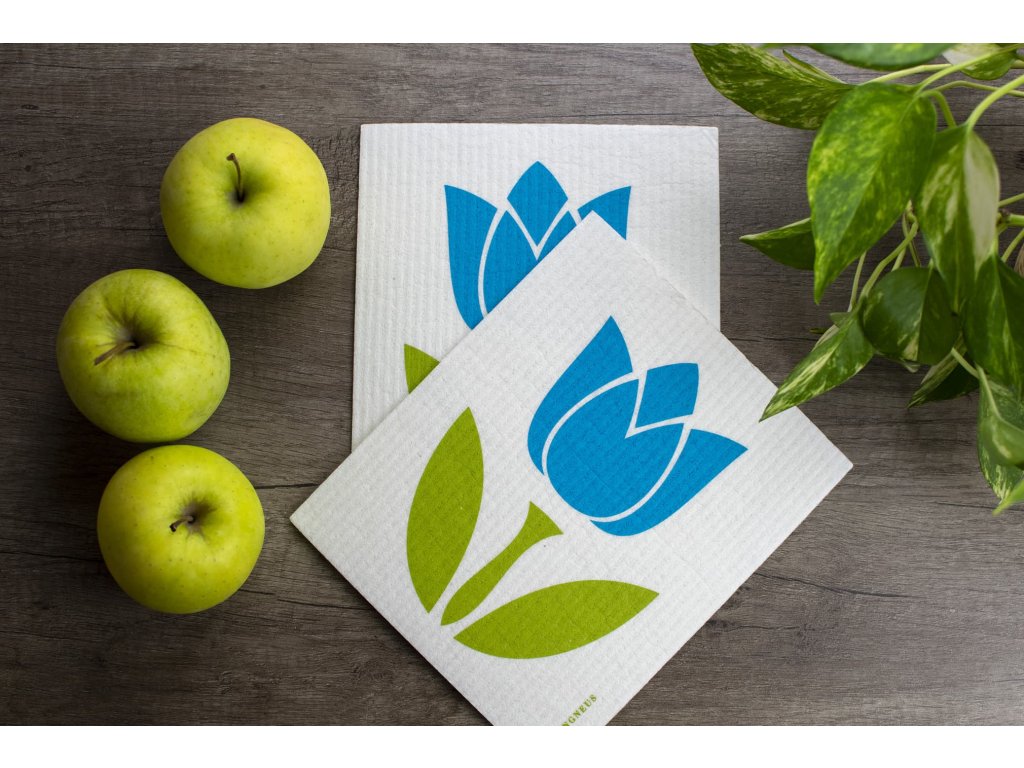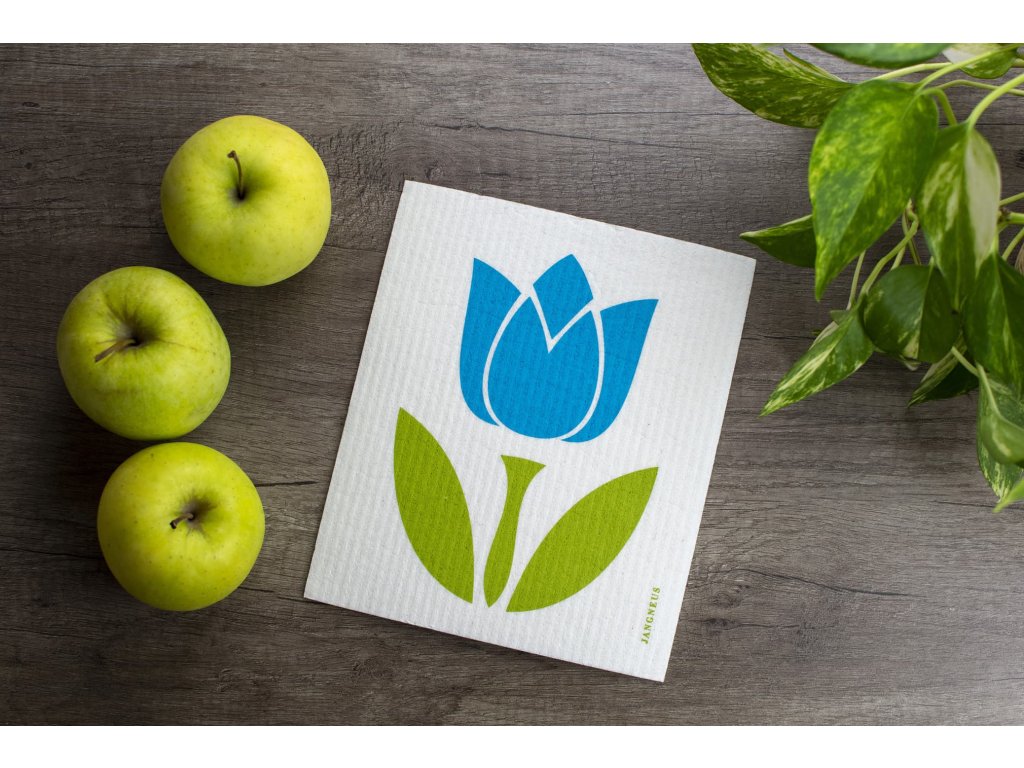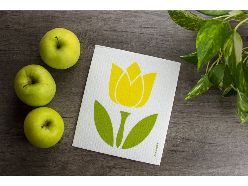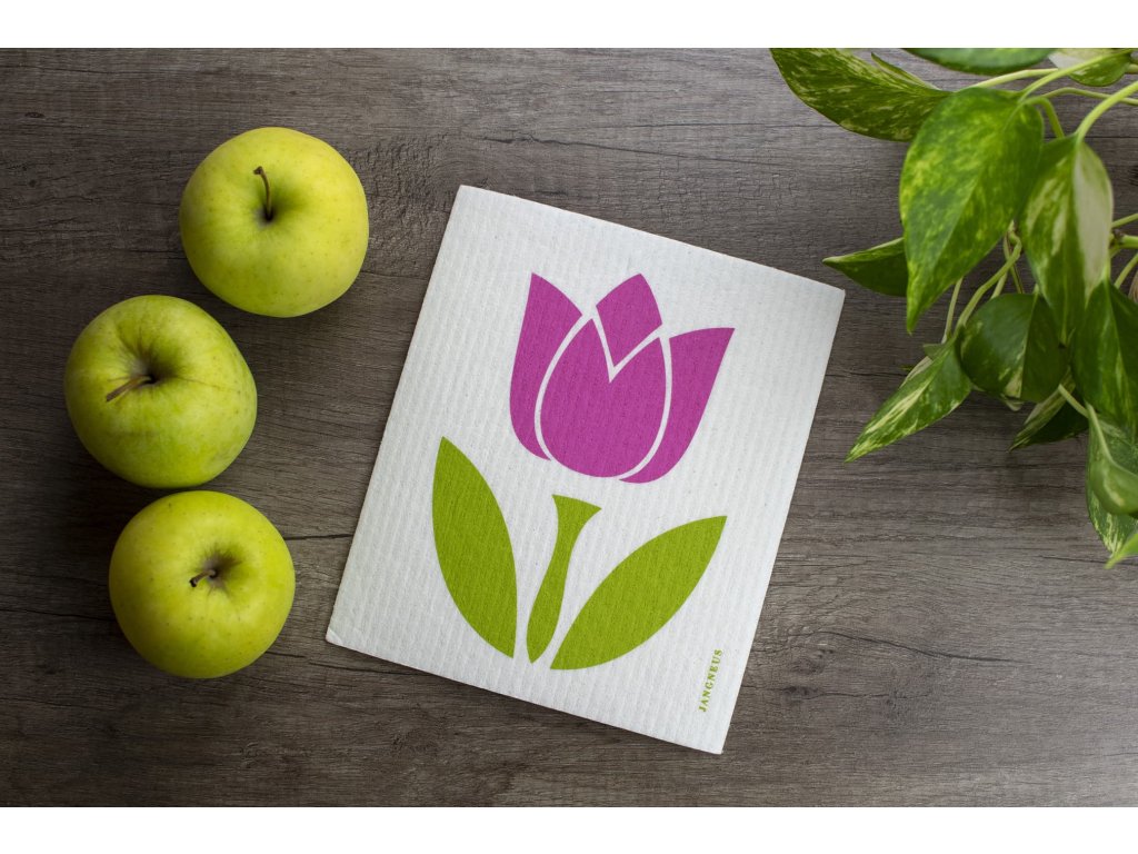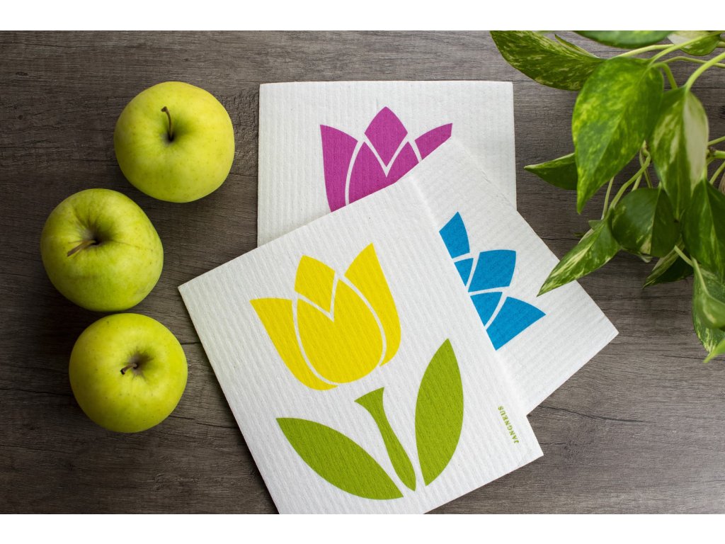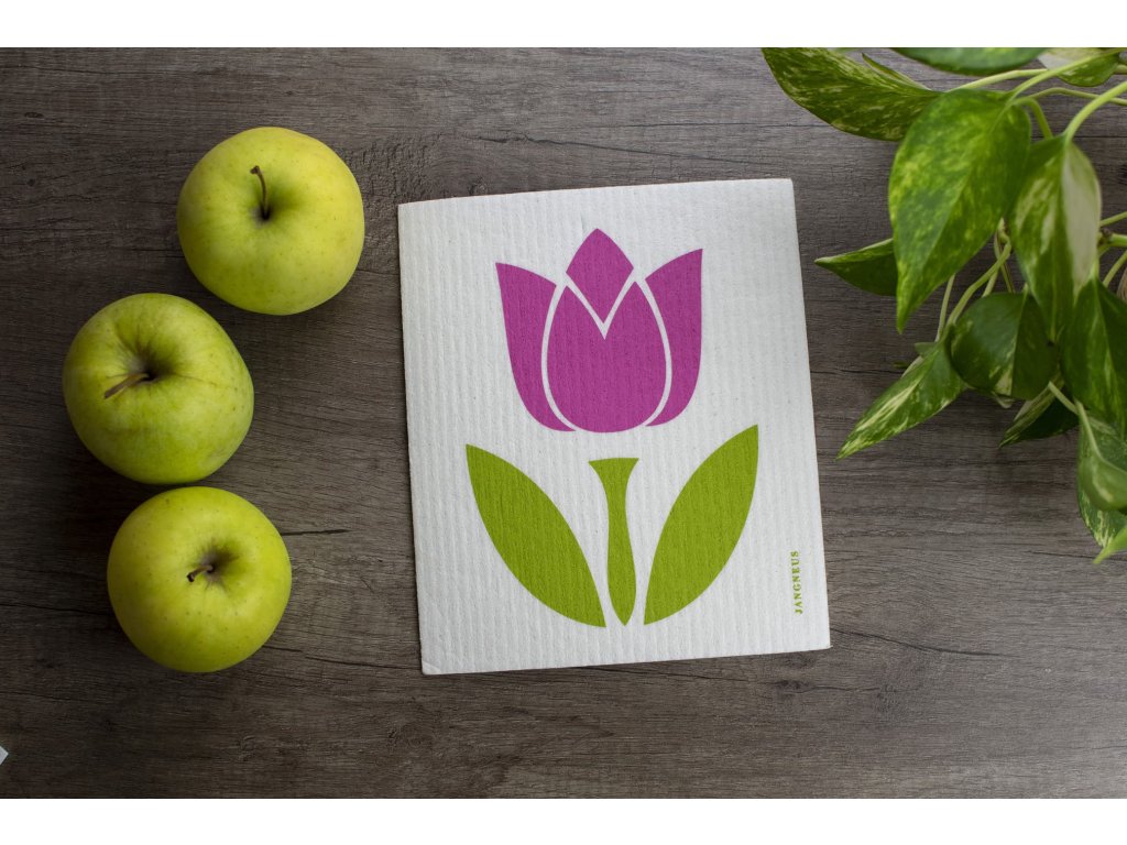 Prateľná hubka z prírodného materiálu v originálnom severskom dizajne s potlačou tulipánu v 3 farebných prevedeniach (ružovozelená, tyrkysovozelená a žltozelená).