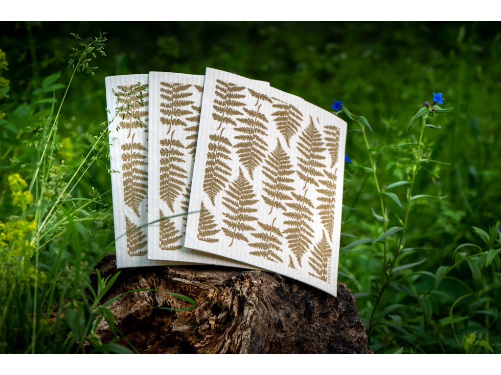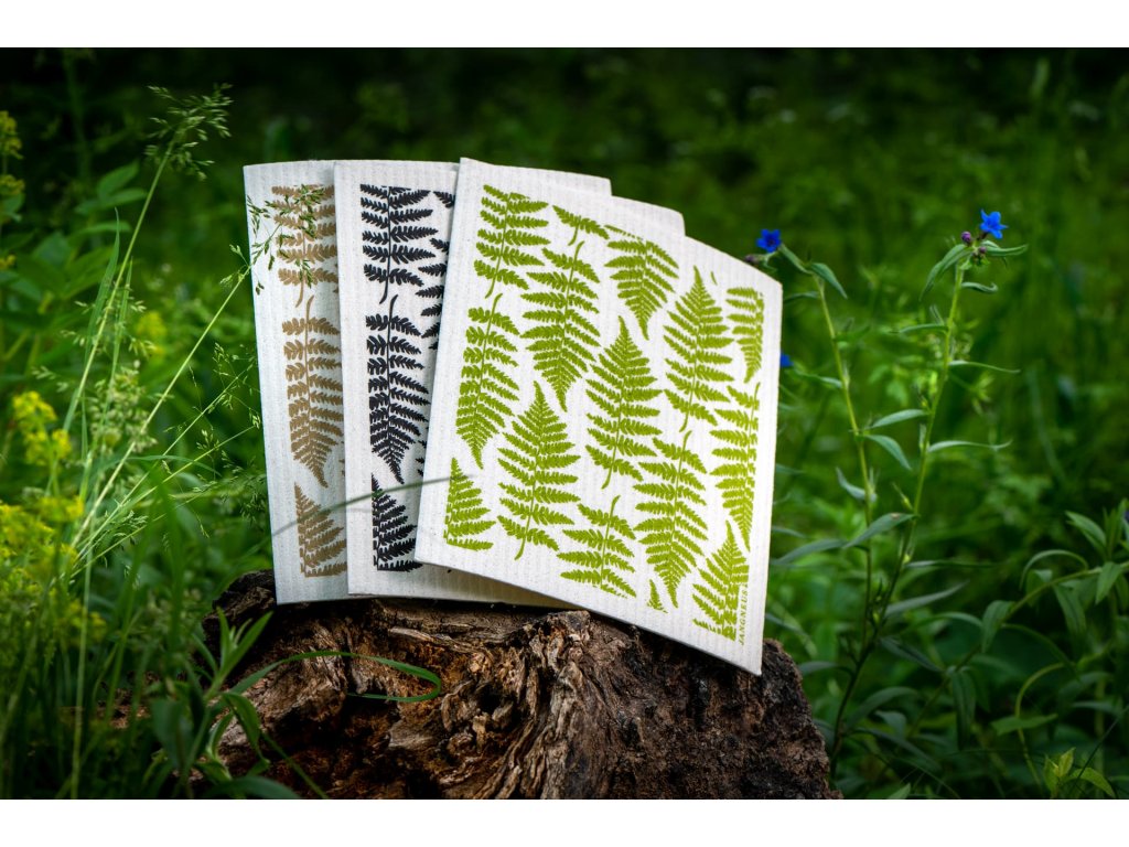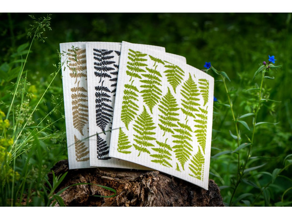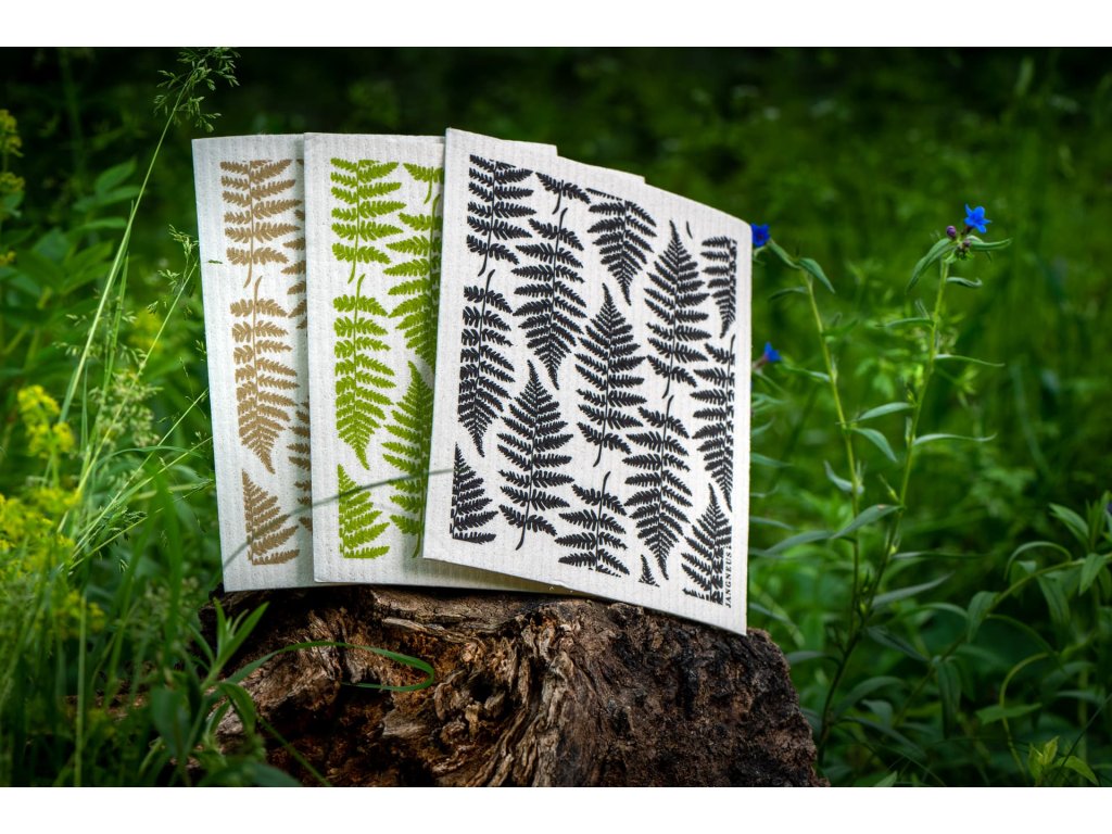 Praktická a zvýhodnená sada prateľných hubiek z prírodného materiálu v originálnom severskom dizajne s potlačou krásnych papradí v 3 farbách (béžová, čierna a zelená).