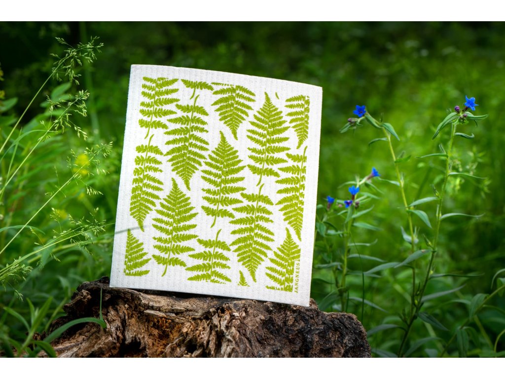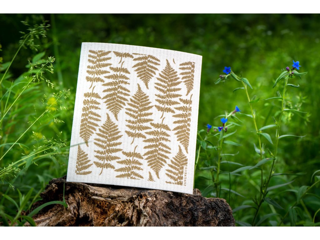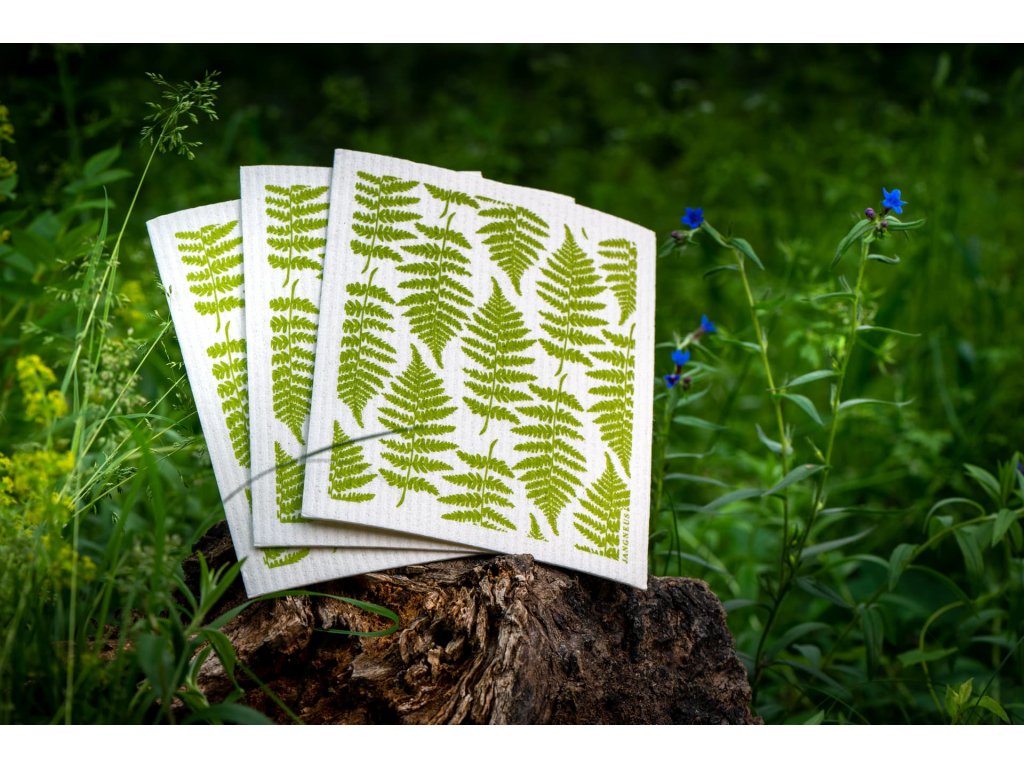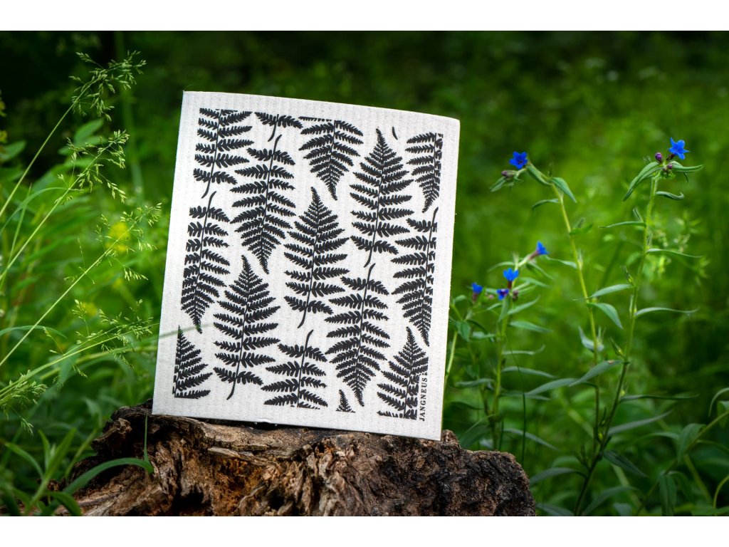 Praktická a zvýhodnená sada prateľných hubiek z prírodného materiálu v originálnom severskom dizajne s potlačou krásnych papradí v 3 farbách (béžová, čierna a zelená).