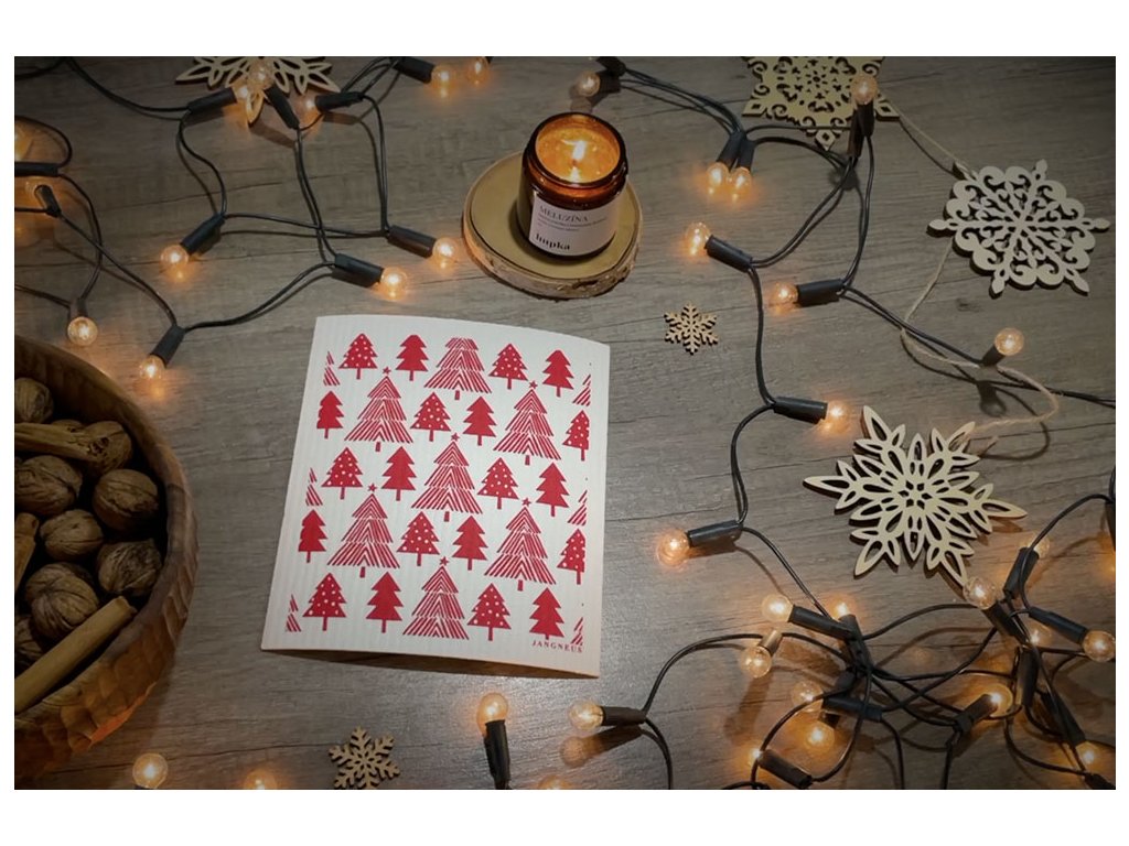 Prateľná hubka z prírodného materiálu v originálnom severskom dizajne s potlačou vianočných stromčekov v 2 farbách (červené a zelené).