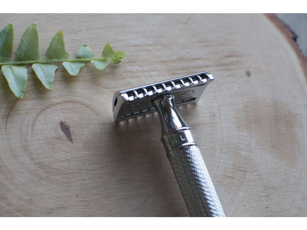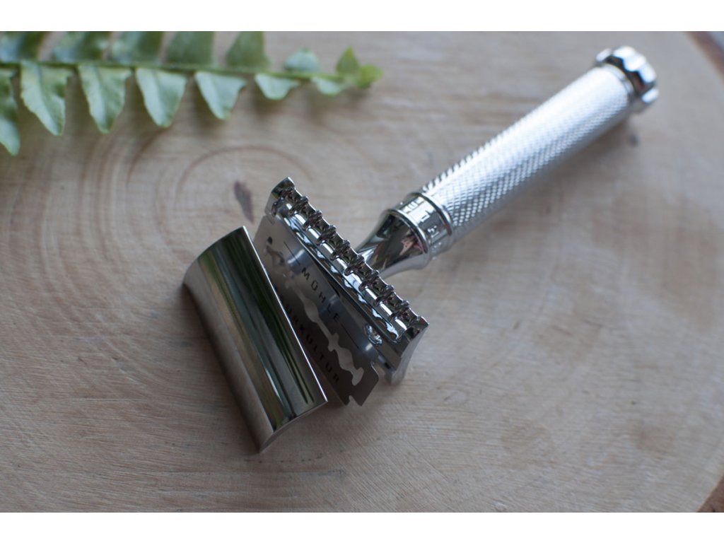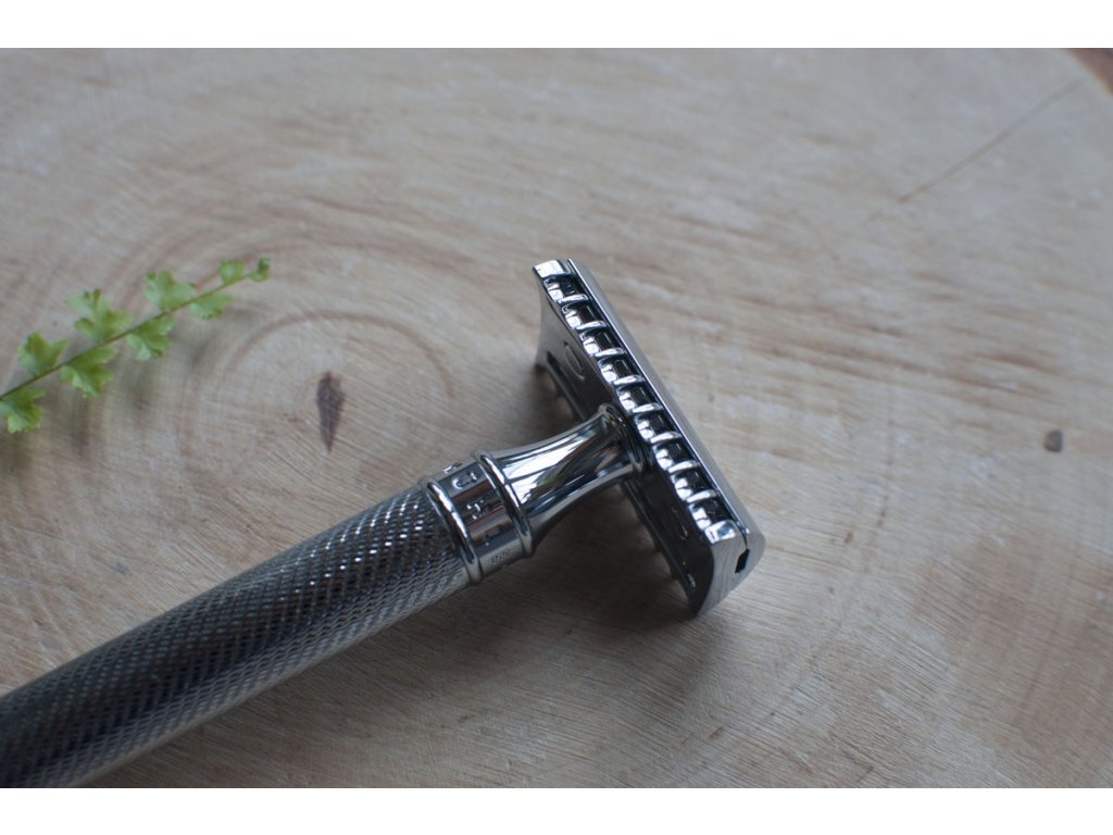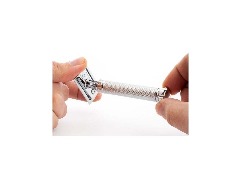 tento obojstranný chrómovaný holiaci strojček na klasické žiletky je praktický pre holenie namokro