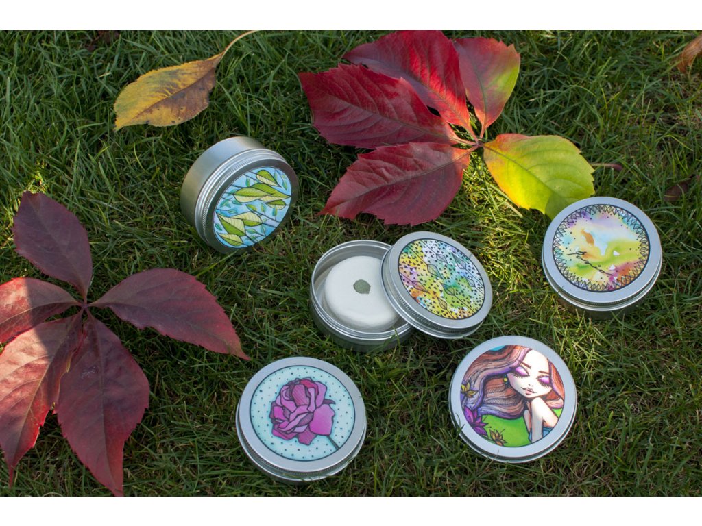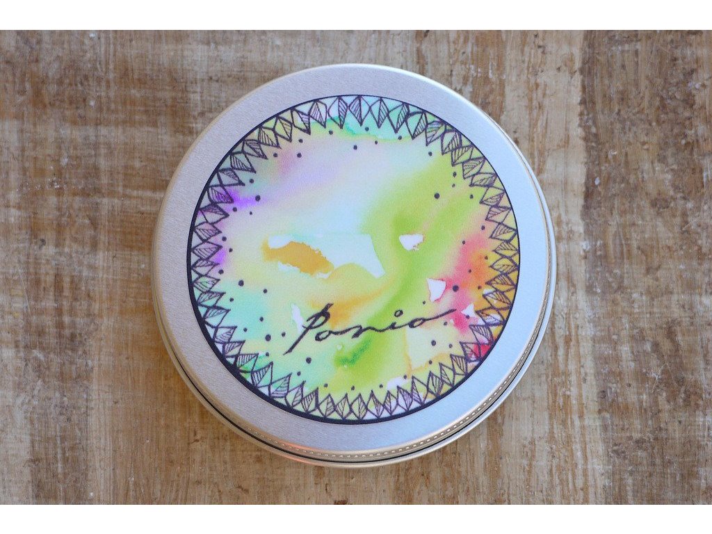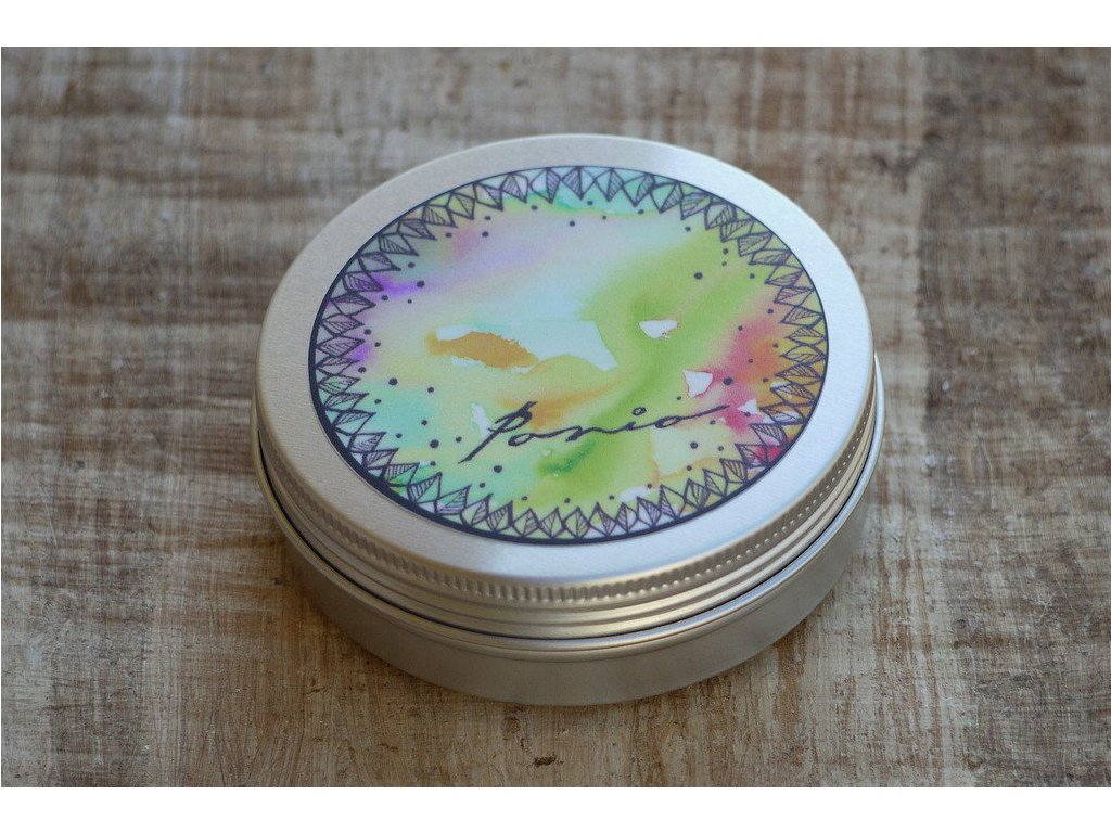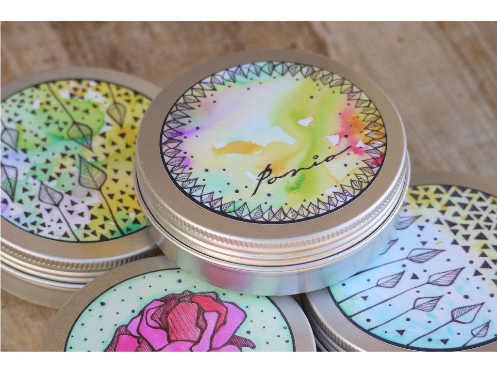 Praktická kovová prenoska krásnou nálepkou s autorskou potlačou je ideálna na prenos prírodnej kozmetiky nielen od Ponio.