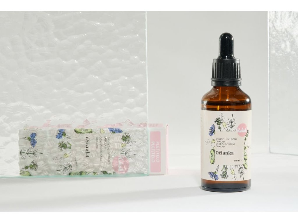 Očný obklad s názvom Očianka z dielne slovenskej značky prírodnej kozmetiky Kvitok poskytuje úľavu a osvieženie unaveným očiam, ktoré majú tendenciu k opúchaniu, preto je ideálny napr. po dlhej práci na počítači.