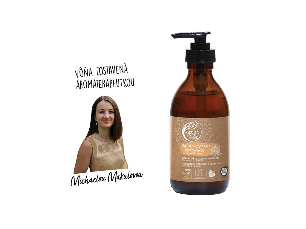 „„Pre sprchový gél Esencia radosti sme vybrali tri esenciálne oleje s vyživujúcim účinkom na pokožku. Pri tvorbe sme vyšli z mojej obľúbenej kombinácie pomaranča, lavandinu a cédru atlaského pre dobrú náladu. Pomaranč tejto zmesi dominuje. Ráno sa vám s ňou bude príjemne vstávať a večer milo zaspávať. Zmes je obľúbená u mužov, žien aj detí,”
