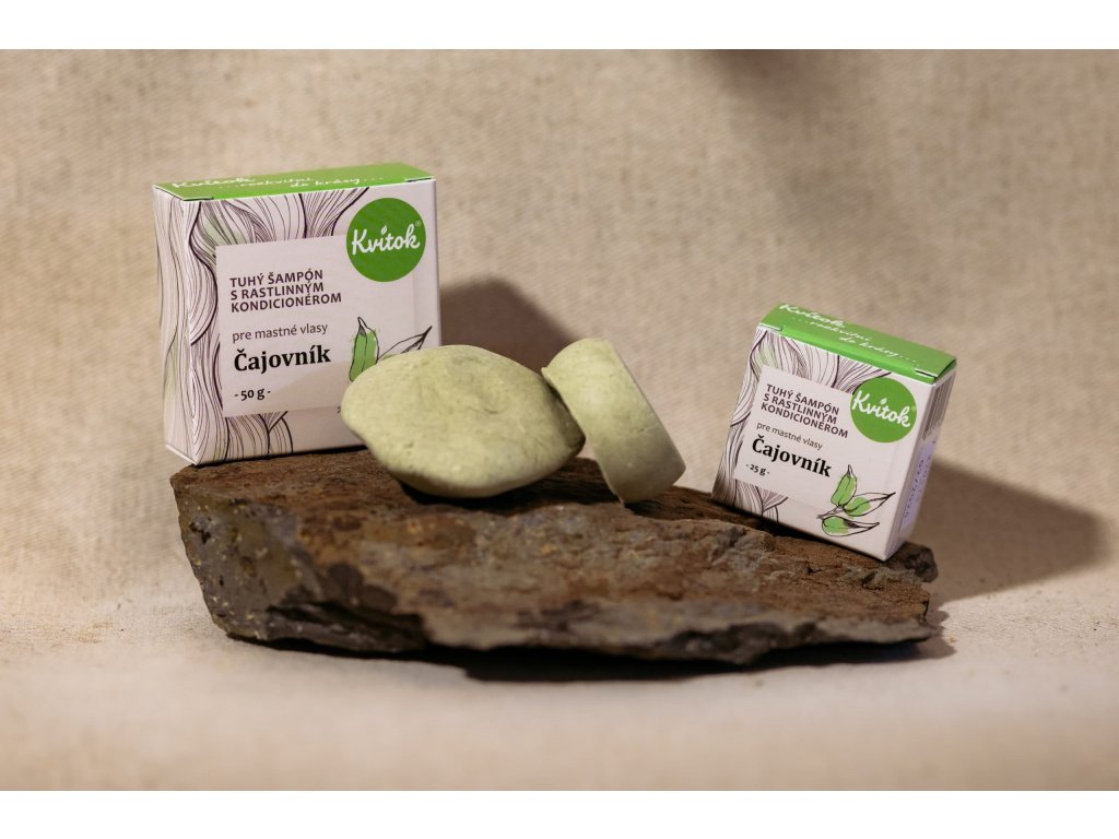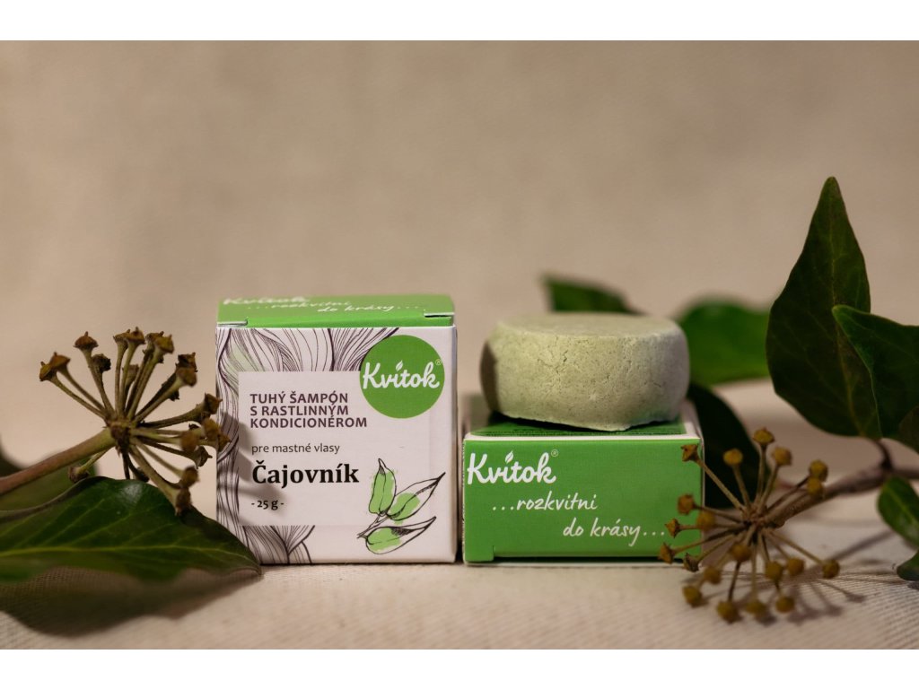 Koncentrovaný tuhý šampón Čajovník od slovenskej značky Kvitok je určený pre všetky typy vlasov, ocenia ho však najmä rýchlo sa mastiace vlasy a pokožka náchylná na svrbenie.