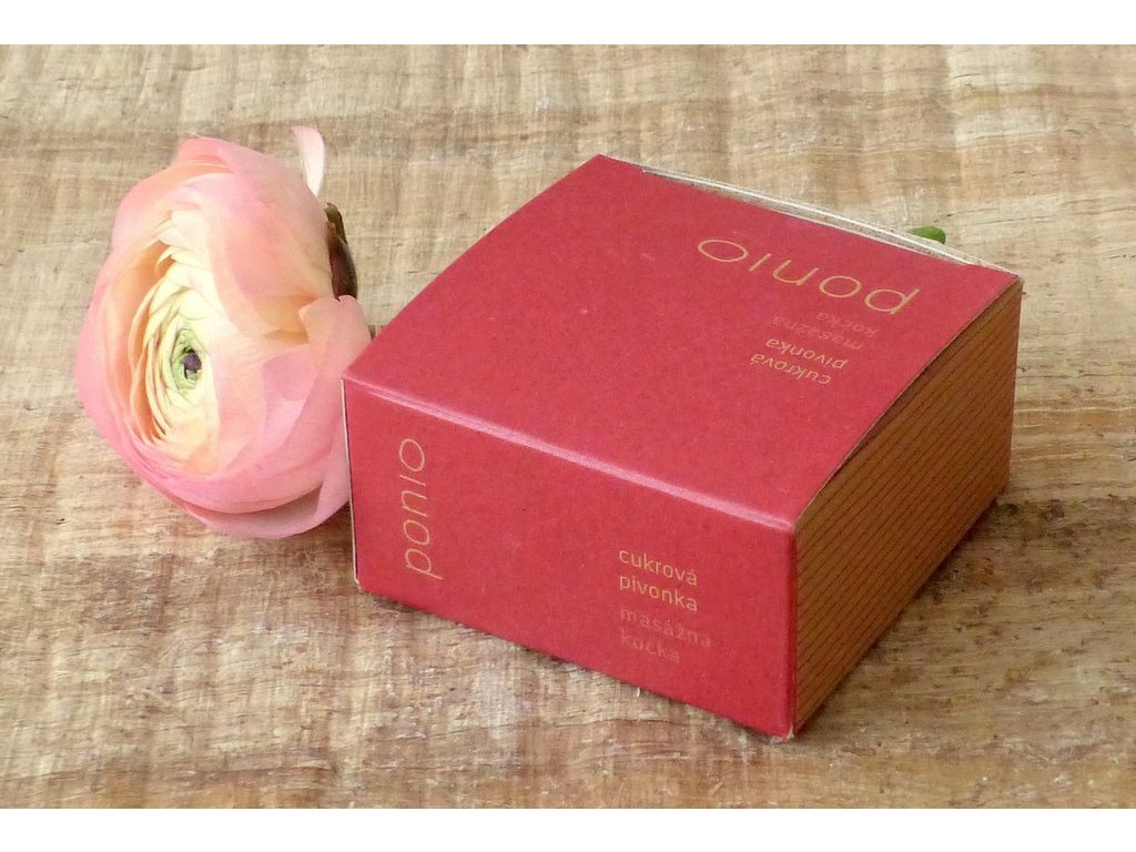 Menšia 50 g verzia v škatuľke je dozdobená lupeňmi pivonky, pred použitím ich odporúčam odstrániť.