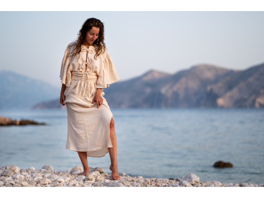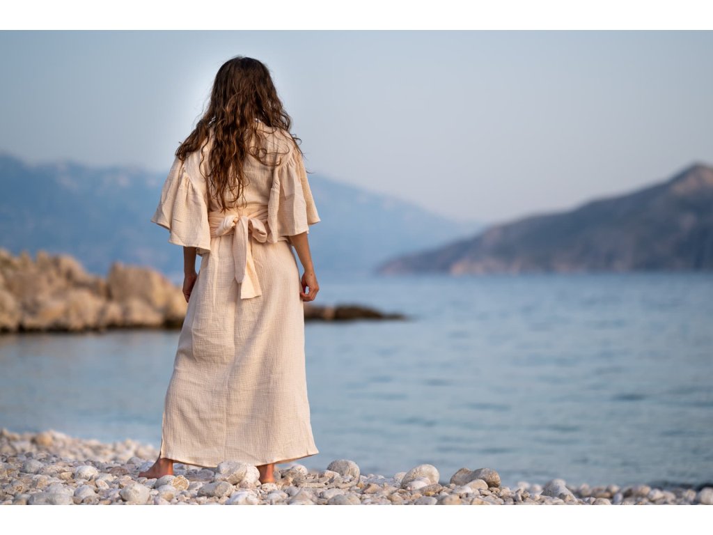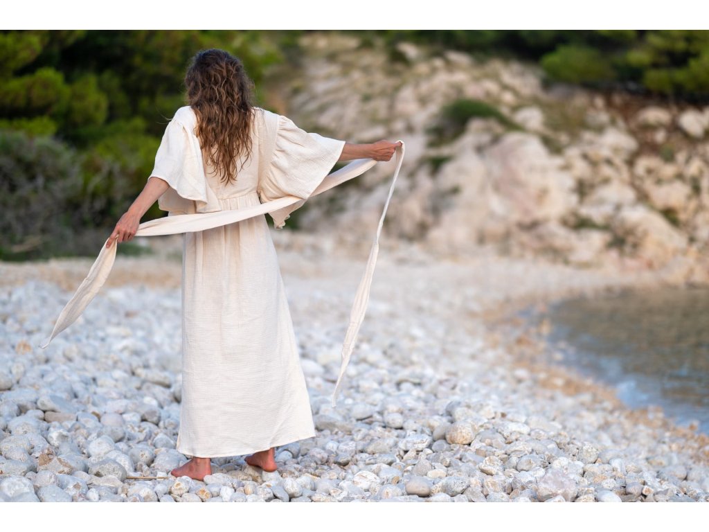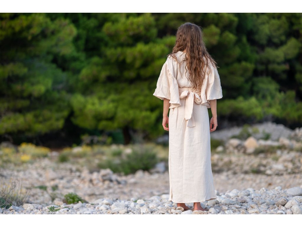 Mušelínové šaty Timea od slovenskej značky Wild Path majú dlhý, voľnejší a v hornej časti zaujímavo prepracovaný strih. Mušelínová látka, teda dvojitá bavlnená gázovina je na dotyk veľmi jemná a pohodlná.