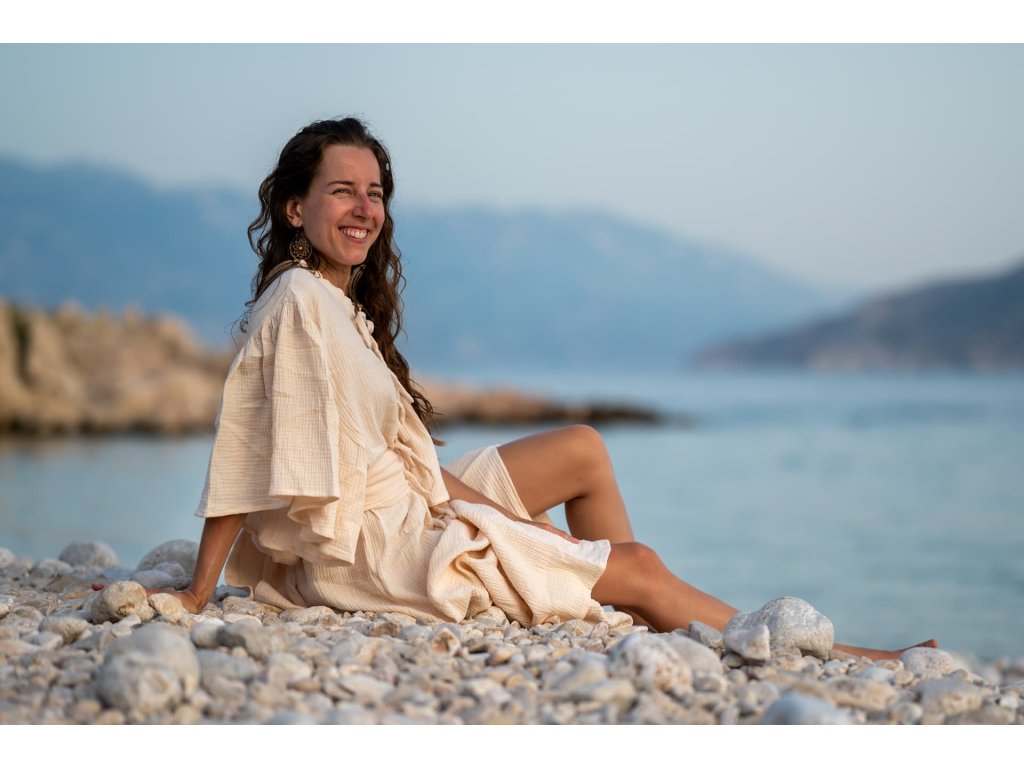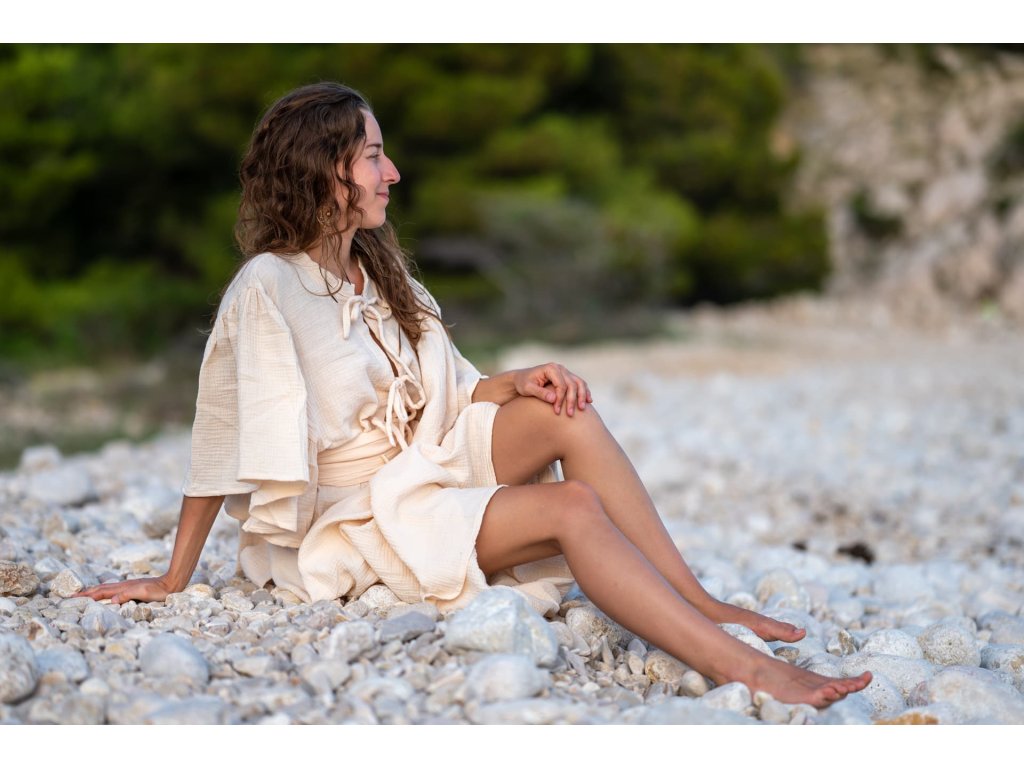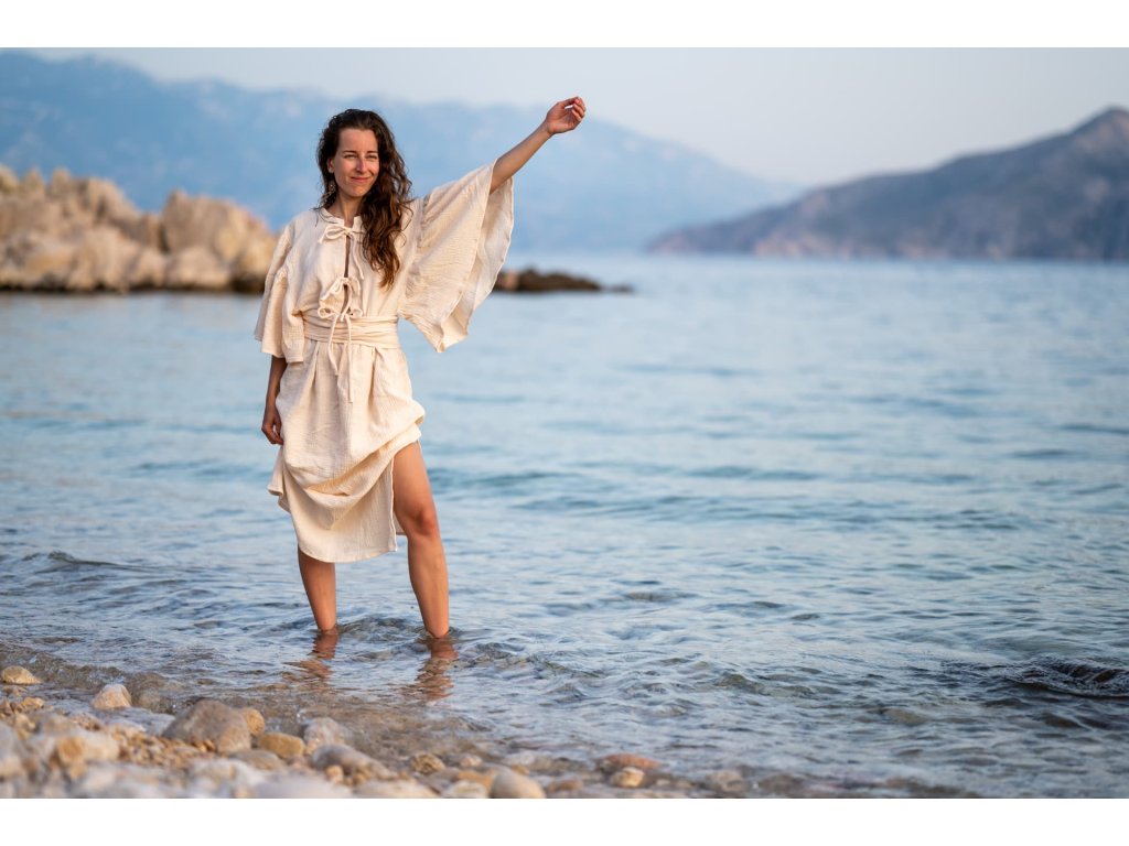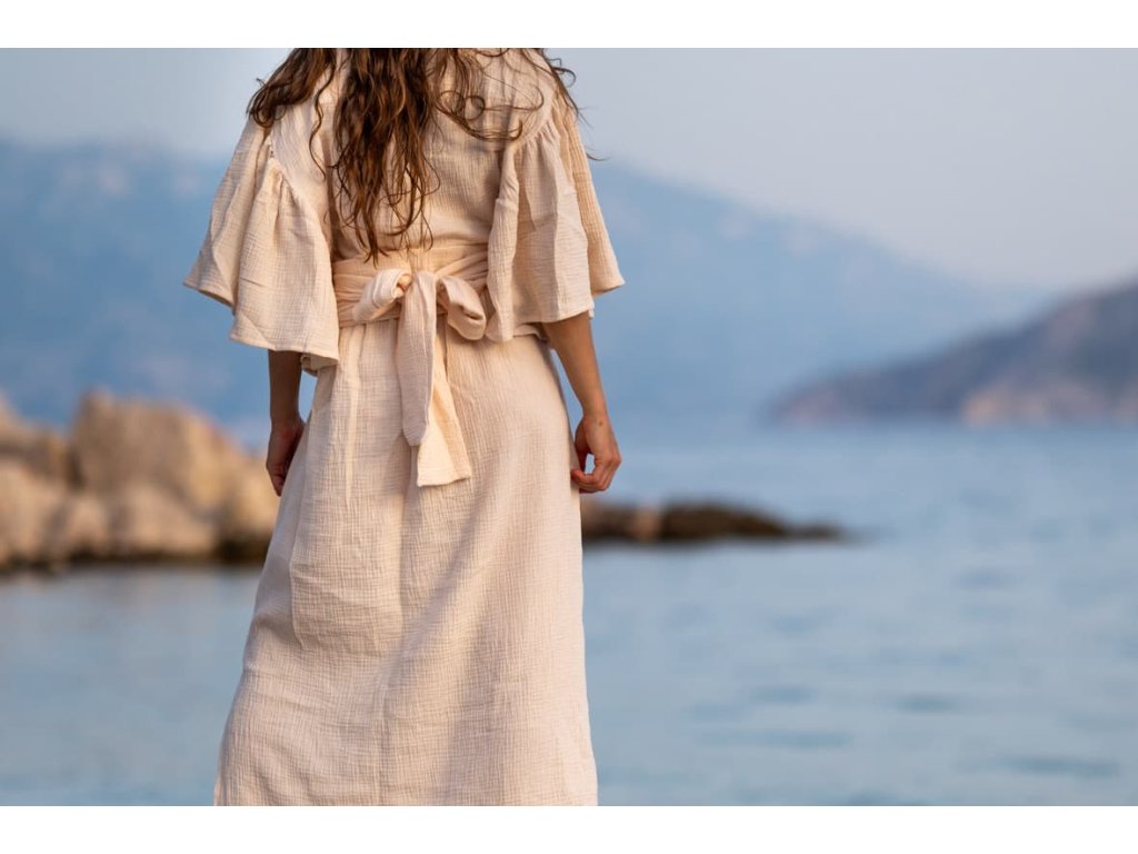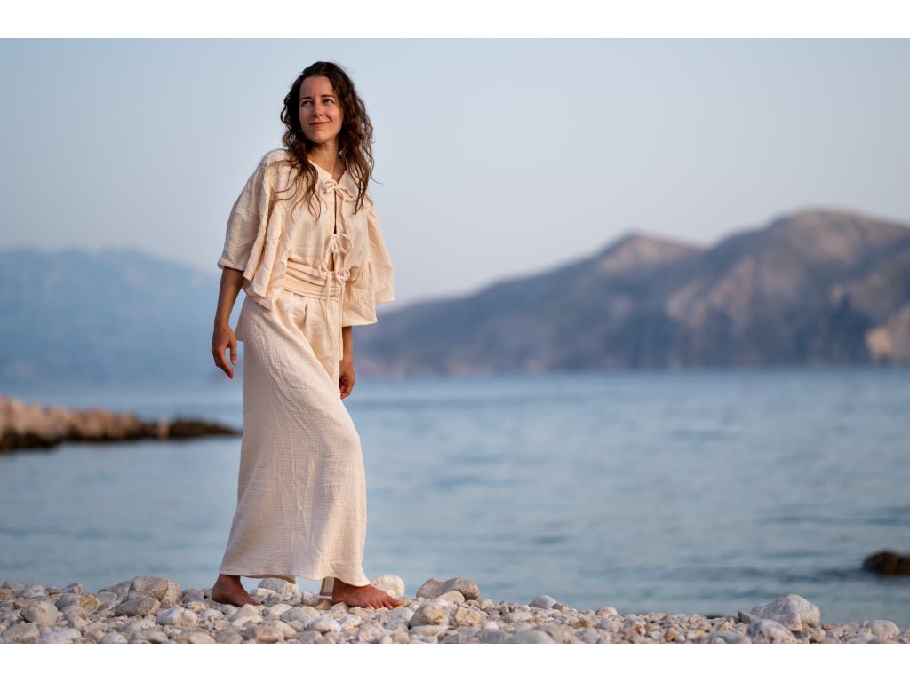 Mušelínové šaty Timea od slovenskej značky Wild Path majú dlhý, voľnejší a v hornej časti zaujímavo prepracovaný strih. Mušelínová látka, teda dvojitá bavlnená gázovina je na dotyk veľmi jemná a pohodlná.