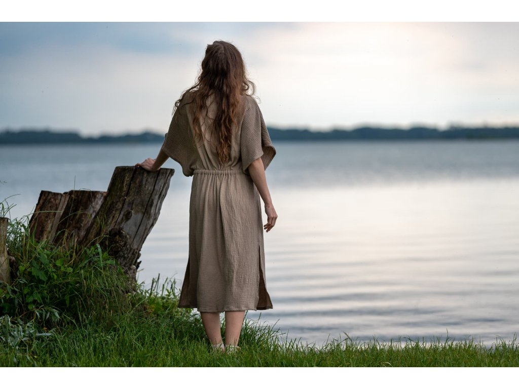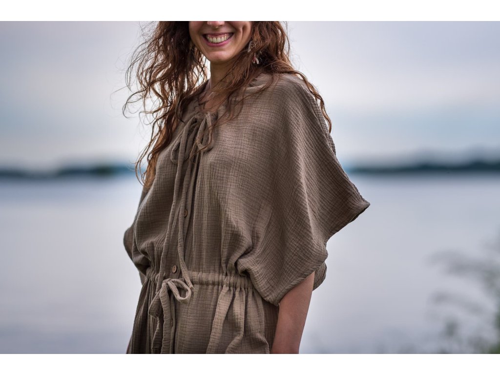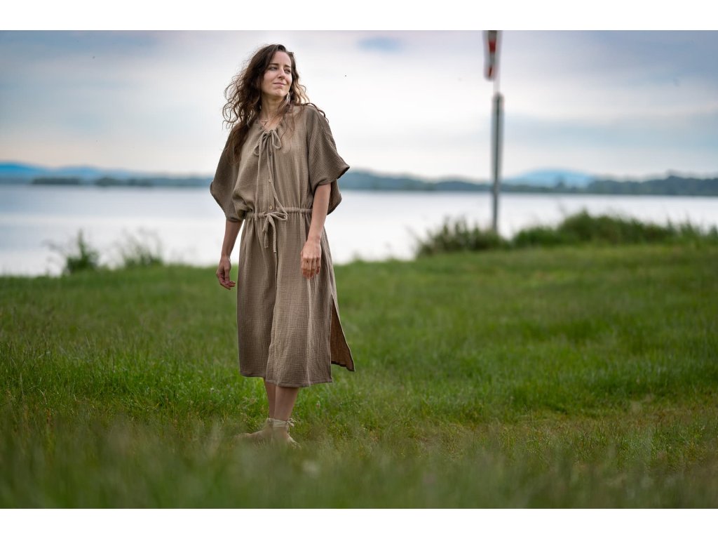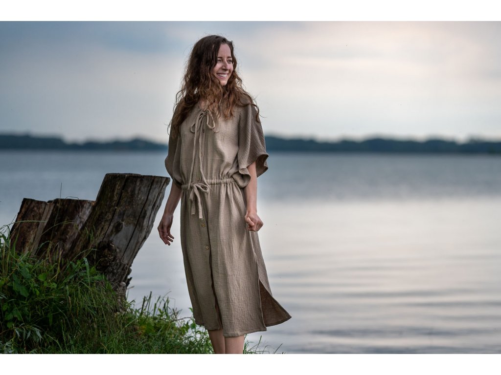 Vzdušné šaty Lesana od krásnej slovenskej značky Wild Path sú ušité zo 100 % organickej bavlny v prírodnej svetlo hnedej farbe.