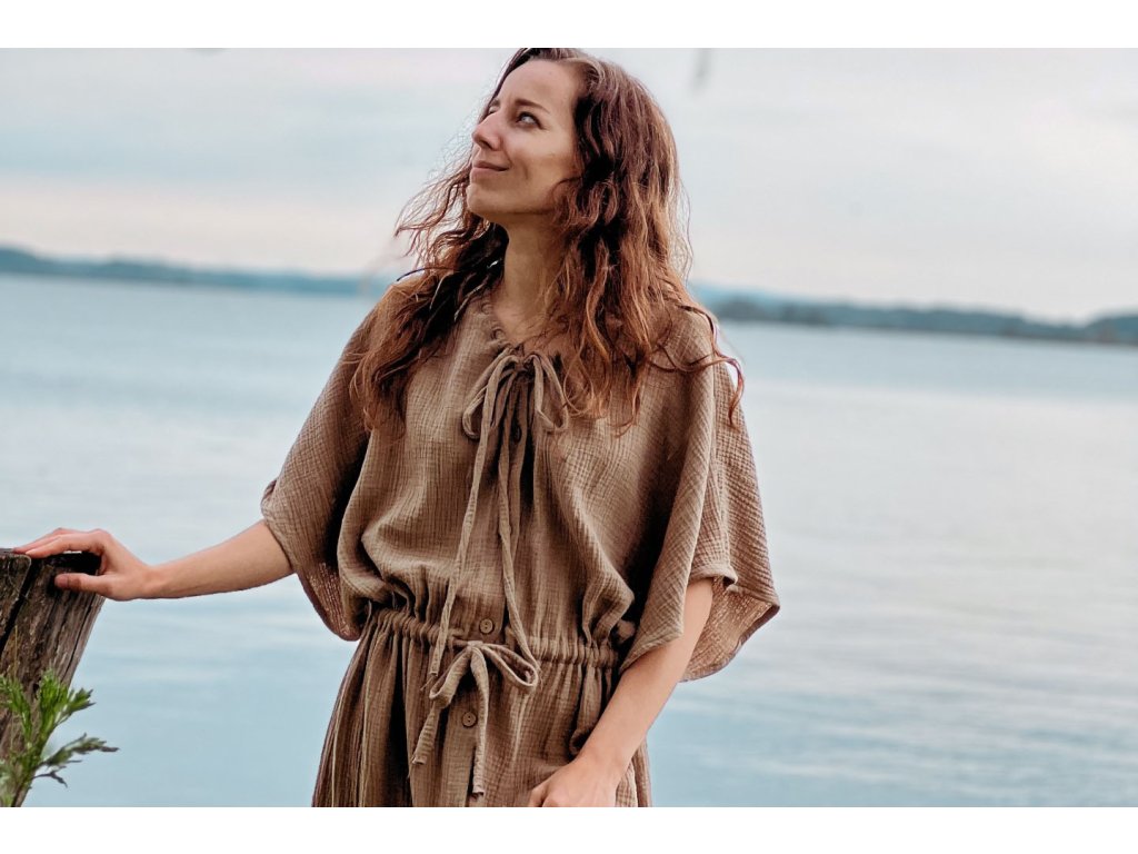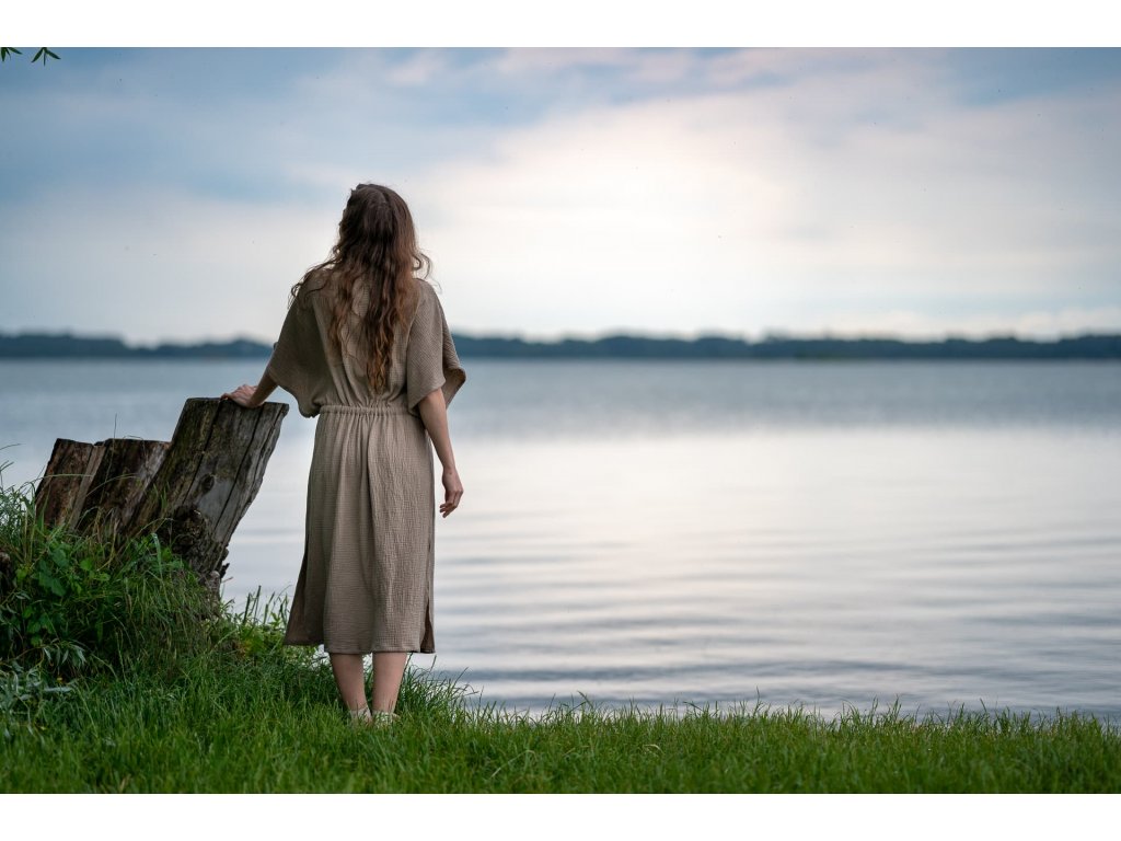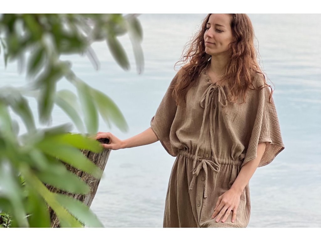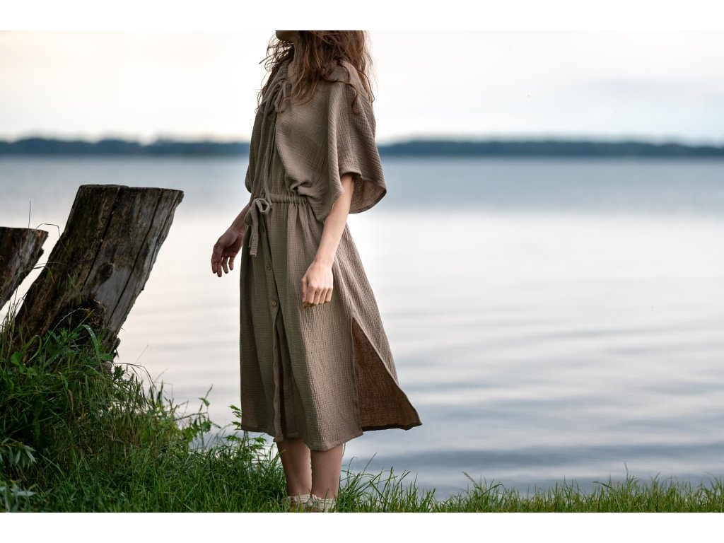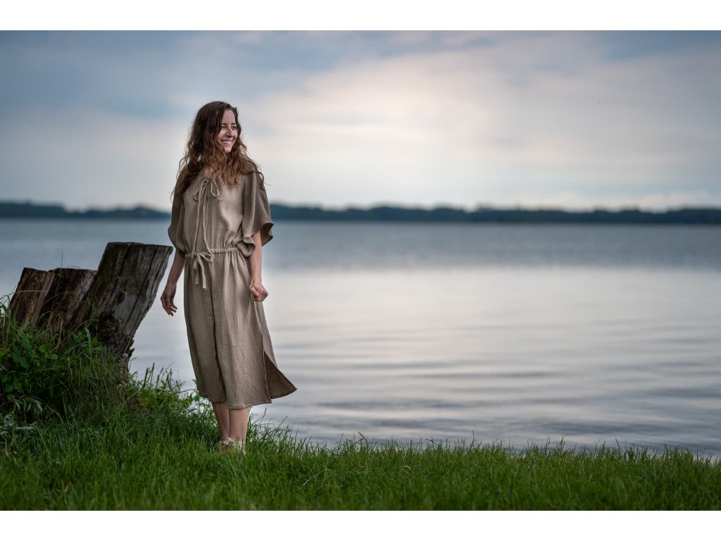 Vzdušné šaty Lesana od krásnej slovenskej značky Wild Path sú ušité zo 100 % organickej bavlny v prírodnej svetlo hnedej farbe.