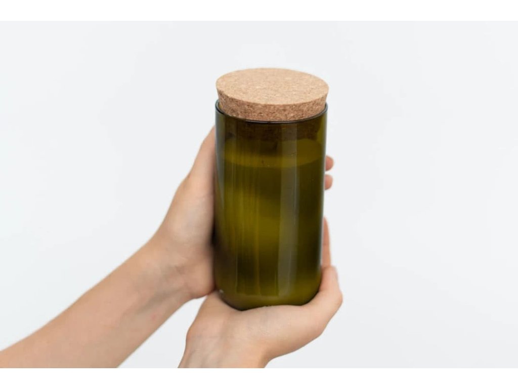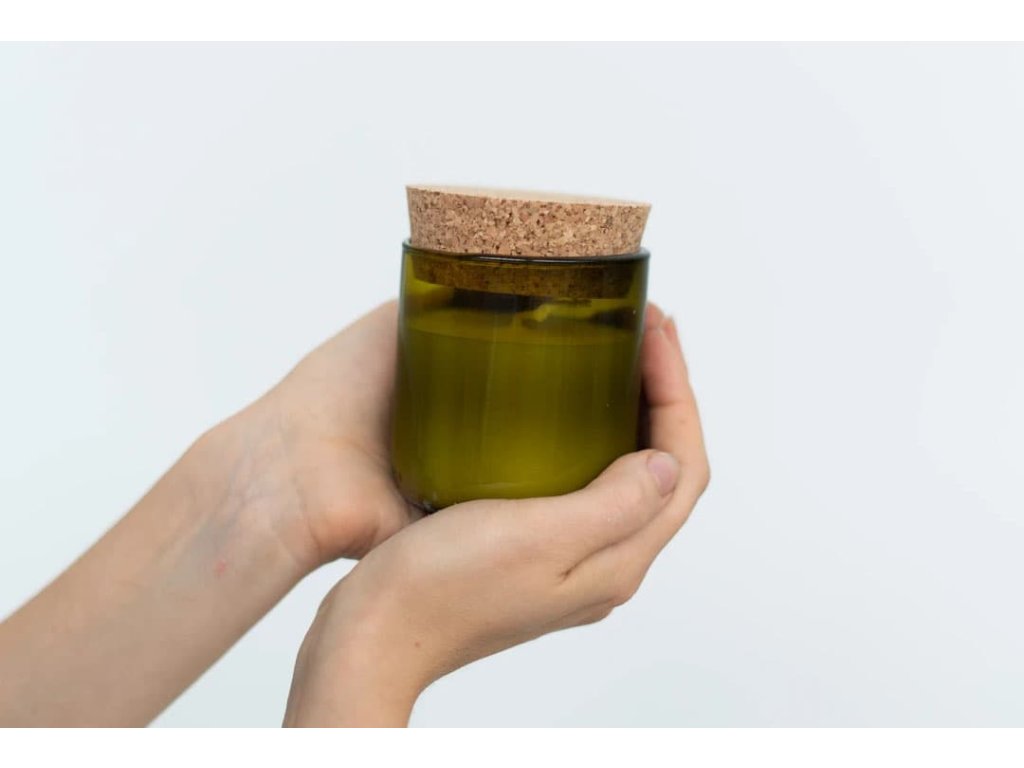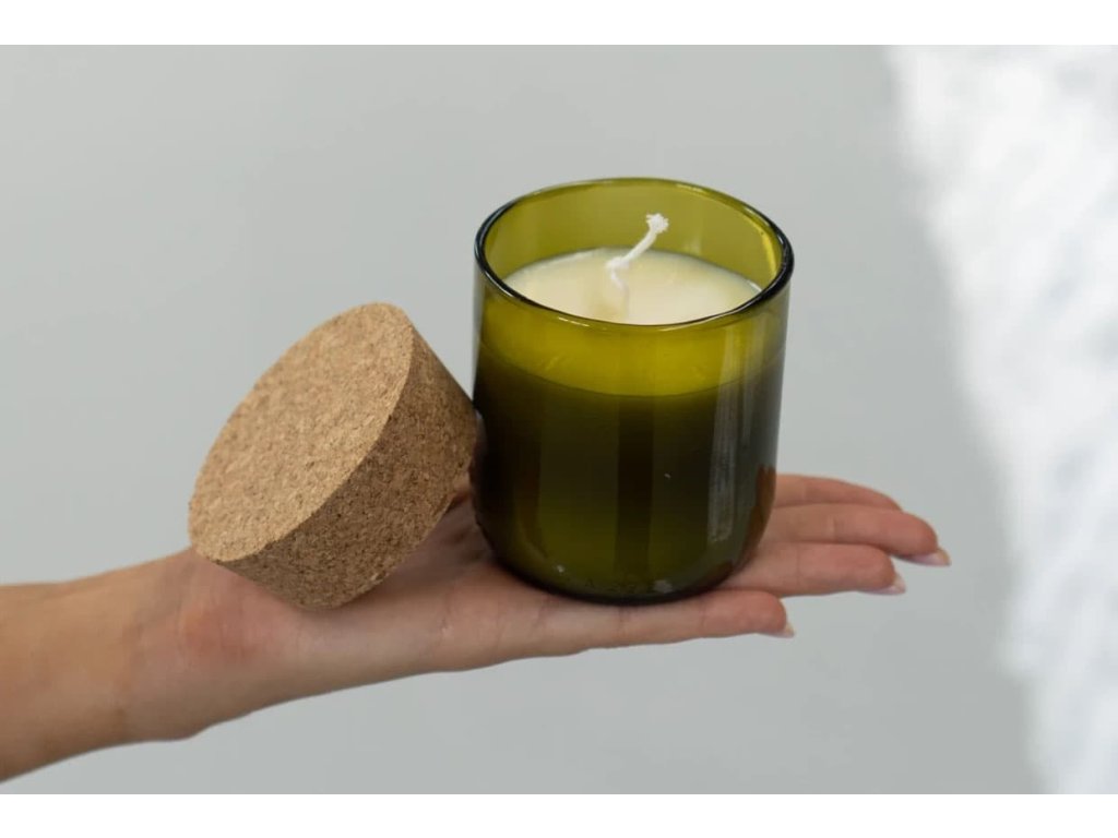 Zdravá sójová sviečka s prírodným korkovým vrchnáčikom z dielne známej slovenskej značky Svetluša je odliata do zeleného skla, ktoré je vyrábané z recyklovaných fliaš.